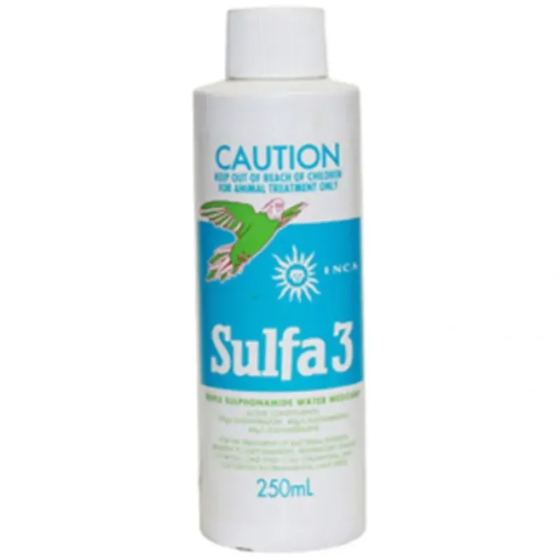 Sulfa 3 is Triple Sulphonamide Water Medicant for the treatment of bacterial enteritis sensitive to sulfonamides, respiratory disease (Coryza), one eyed cold (Chlamydia), and coccidiosis in ornamental cage birds. This product is registered for ornamental birds only.