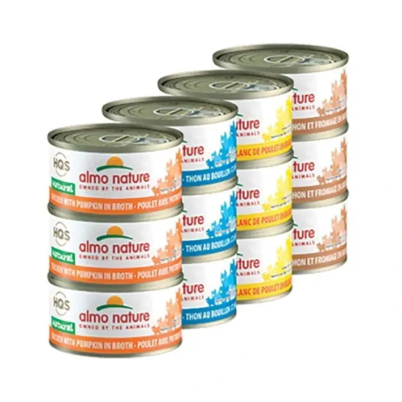 Almo Nature’s HQS Natural Rotational Pack 1 Grain-Free Canned Cat Food comes with 4 healthy and flavorful recipes to rotate between: Chicken Breast, Tuna with Cheese, Chicken with Pumpkin, and Atlantic Tuna. Made with real, all-natural chicken or tuna as the first ingredient and cooked in minimal water to create a moist, tasty broth, they deliver simplicity and authenticity that even the finickiest of cats will adore. The meals are free of preservatives and additives, and naturally rich in highly digestible proteins (min. 15% to 17%), essential amino acids and micronutrients to help your cat thrive. Plus, every bite is crafted with HQS (High Quality Sourced) ingredientsâmeat and fish originally fit for human consumption and now solely used for pet food to help nourish your furry friend!