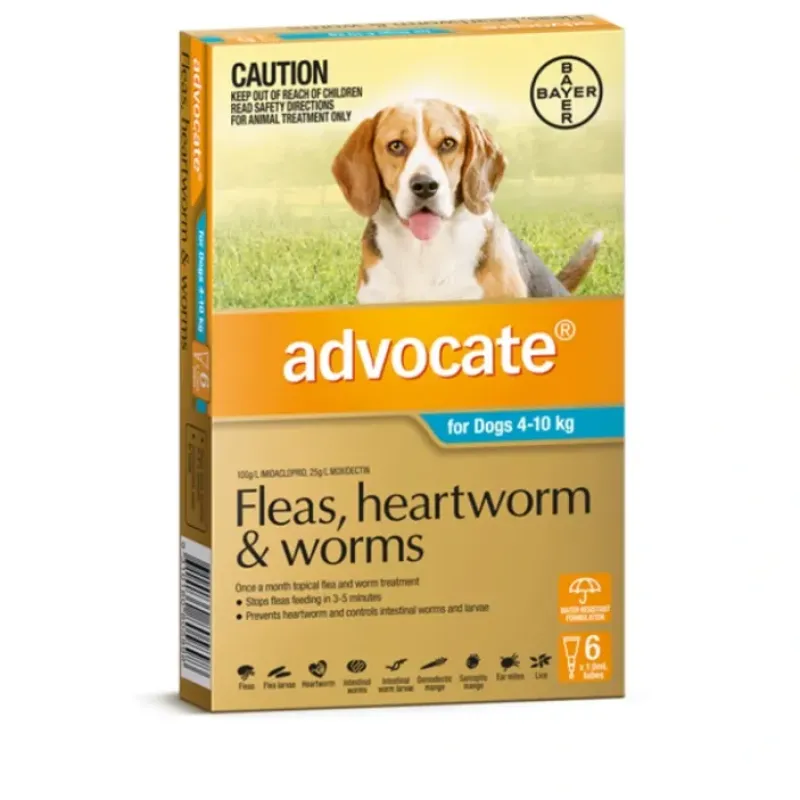 Advocate for Dogs kills fleas, prevents heartworm, hookworm, roundworm and whipworm and controls mange and lice with monthly topical application.