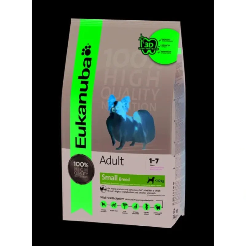 Eukanuba Adult Small Breed provides optimal nutrition for small breed adult dogs (1-10kg) It contains 8% more protein and 20% more fat* ideal for a small breed’s higher metabolism and smaller tummy, plus the kibbles are small, designed for easy chewing and digestion. It contains high quality ingredients such as animal based protein (chicken our No 1 ingredient), fat, carbohydrates, fibres and important vitamins and minerals for the health and wellbeing of your adult small breed dog.