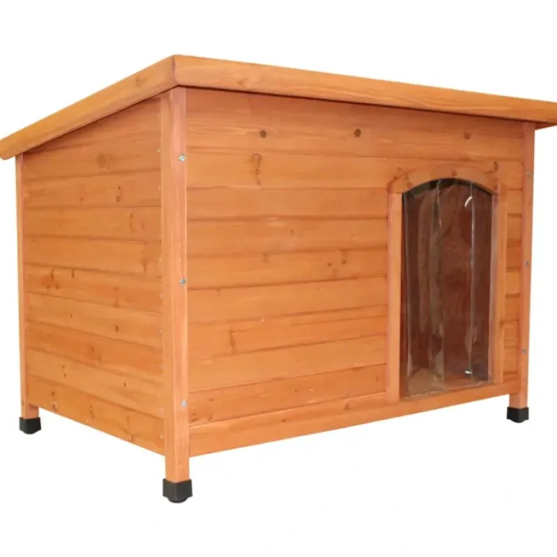 Large Dog Kennel Log Cabin DKF116L is a high quality large wooden dog kennel which is suitable for medium and large breed dogs and puppies. This natural wooden dog kennel features a waterproof and UV proof asphalt roof which lifts up for easy cleaning and maintenance. It also comes with a detachable PVC door flap to protect your pooch from the wind and rain. The floor is removable, and raised from the ground to help ventilate & keep the floor dry and warm. Also features adjustable feet to keep it stable.