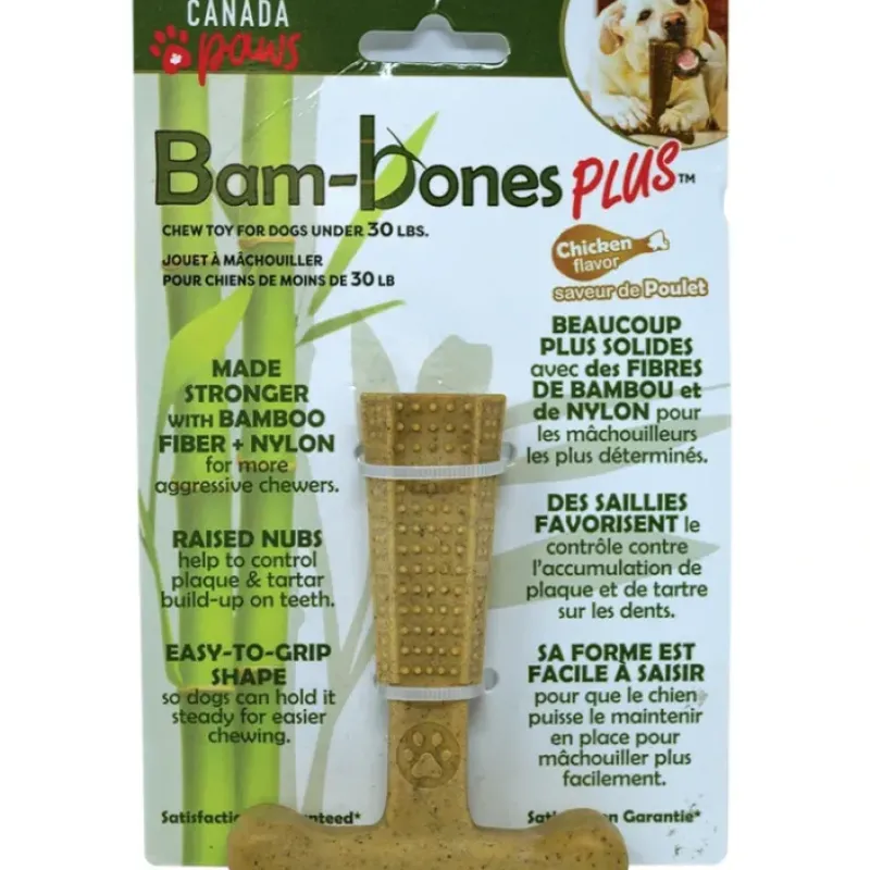 | Our Bam-Bones Plus chew toys are made stronger with naturally sustainable bamboo fiber and nylon for the most aggressive chewers! They have an easy-to-grip shape so dogs can hold it steady for easier chewing. They also include raised numbs to help control plaque and tartar build-up on teeth. Chicken Flavoured. •Chicken Flavour •Durable and long lasting •Bamboo is a sustainable resource •Raised nubs help control plaque and tartar build-up, minimising bacteria and bad breath •Keeps dogs busy for hours •Easy-to-grip shape |