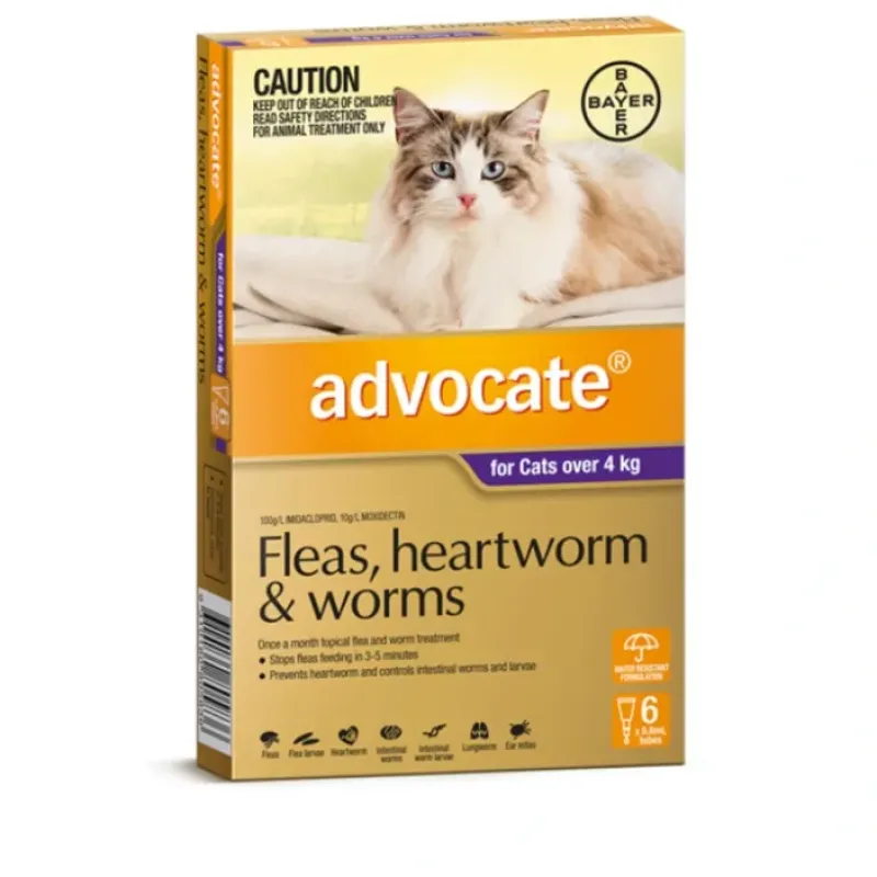 Advocate for Cats is a monthly spot-on type medication for the prevention of heartworm, and the treatment of fleas, hookworm, roundworm, ear mites and lungworms in cats.