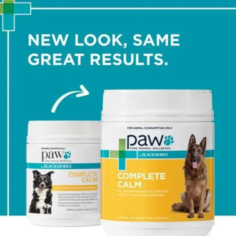 PAW Complete Calm chews are available in a 300g tub. Each tub contains approximately 60 chews.