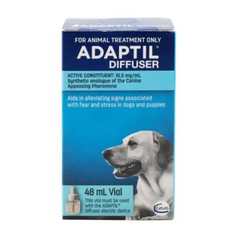 You will require anAdaptil Diffuserto use this product.- this is a replacement refill. Adaptil comforts and reassures dogs and puppies to make them feel calm and relaxed.It does this by emitting calming pheramones.This product is clinically proven and is recommended by vets.This refil requires an Adaptil diffuser to work, Simply screw this vial into the Adaptil diffuser – plug it in to electrical socket and switch on the power.Key Benefits:Designed to be left onOne diffuser will cover an area of approx 70m2Recommended by behaviourists and vets around the worldTake a look at theadaptil diffuserfor more information on how it works!