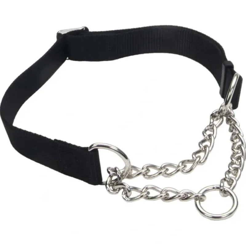 Check-Collars are a limited-closure chain combined with a standard collar. The Check-Collar is designed to offer a humane and effective training device. The dog will quickly react to the crisp sound of the chain. The nylon section of the collar is designed to reduce the loss of neck hair and eliminate matting for long-haired coats. The unique Limited closure prevents the collar from becoming too tight.