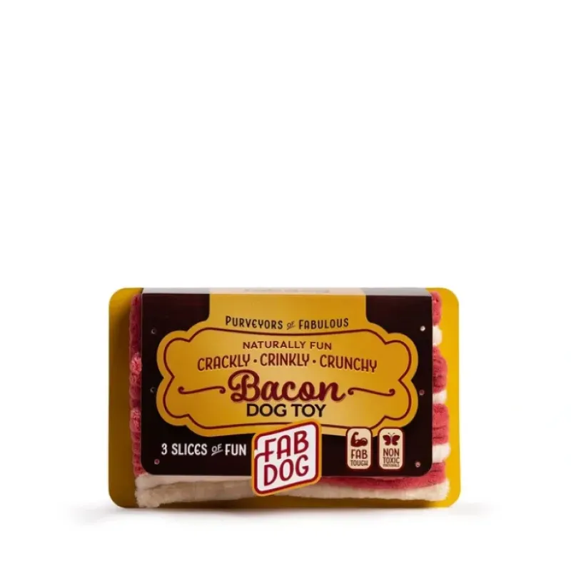 Give your pup a taste of fun with the fabdog Bacon Dog Toy. This set includes three crinkly, crunchy bacon slice toys, each equipped with a squeaker for maximum enjoyment. Perfect for engaging your dog in active play and satisfying their chew instincts.