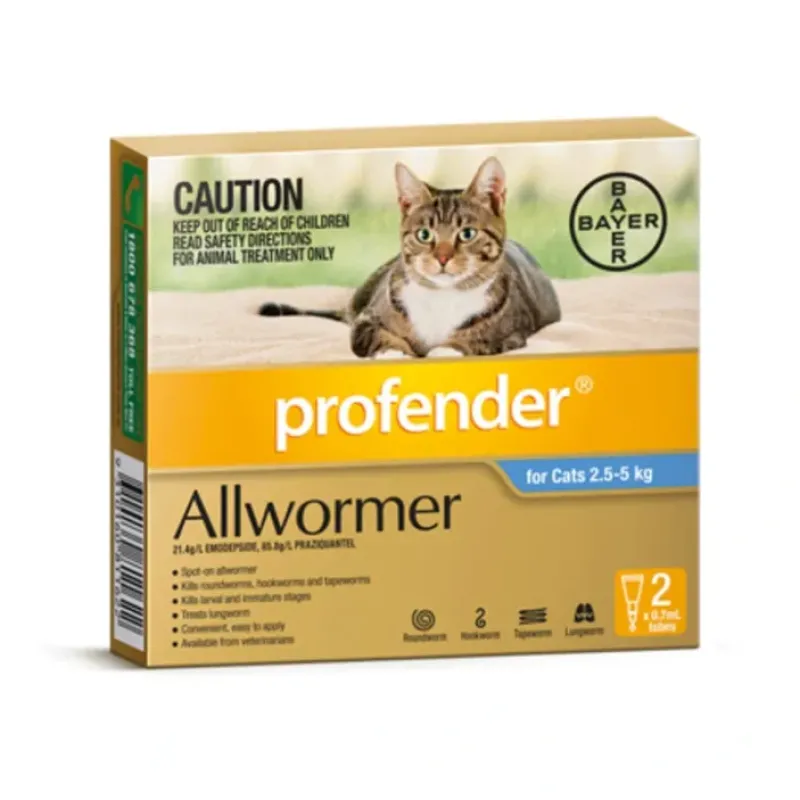 Used every 3 months, Profender kills all infective stages of roundworms, hookworm and tapeworm and treats lungworm, hence protecting your cat and your family from gastrointestinal parasitic worms.